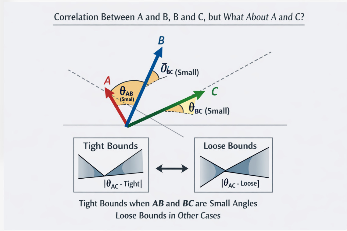 The answer is that we can estimate but not put a tight bound. That A is positively correlated to B, and B is positively correlated to C, doesn’t tell us much about the correlation between A an C.