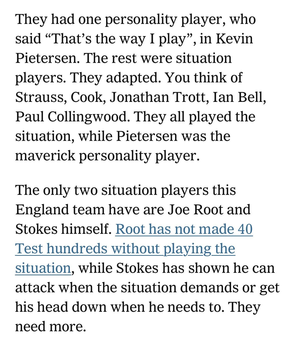 Some people are always the way they are. They don’t care about the situation and they just play the way they normally do. Others are more adaptive and suppress their natural game if the situation demands otherwise. Hussain’s complaint was that England now had too many “personality” players, which meant that the team was not adaptive enough.