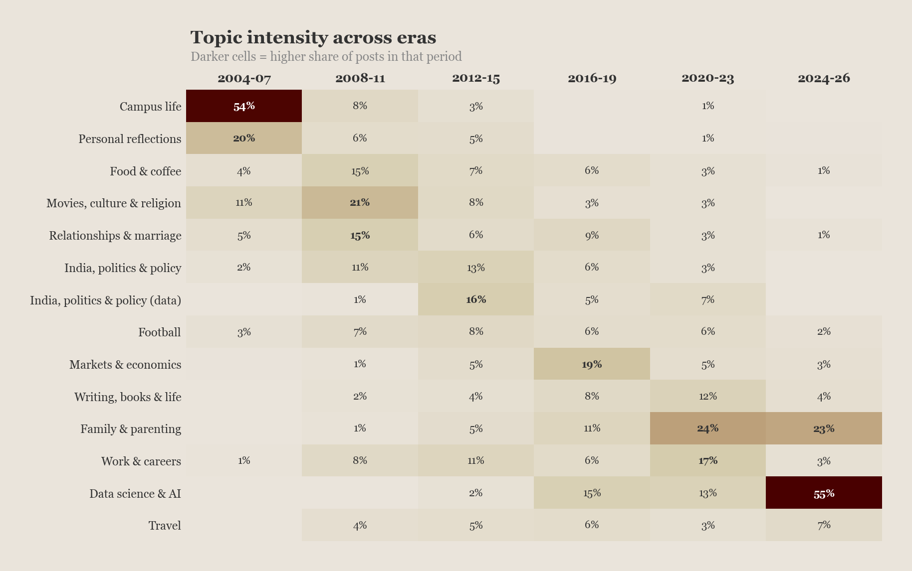 The heatmap tells this story cleanly. The top-left is dark - campus life and personal reflections dominating the early years. Then there’s a diagonal shift downward and rightward as new topics take over.