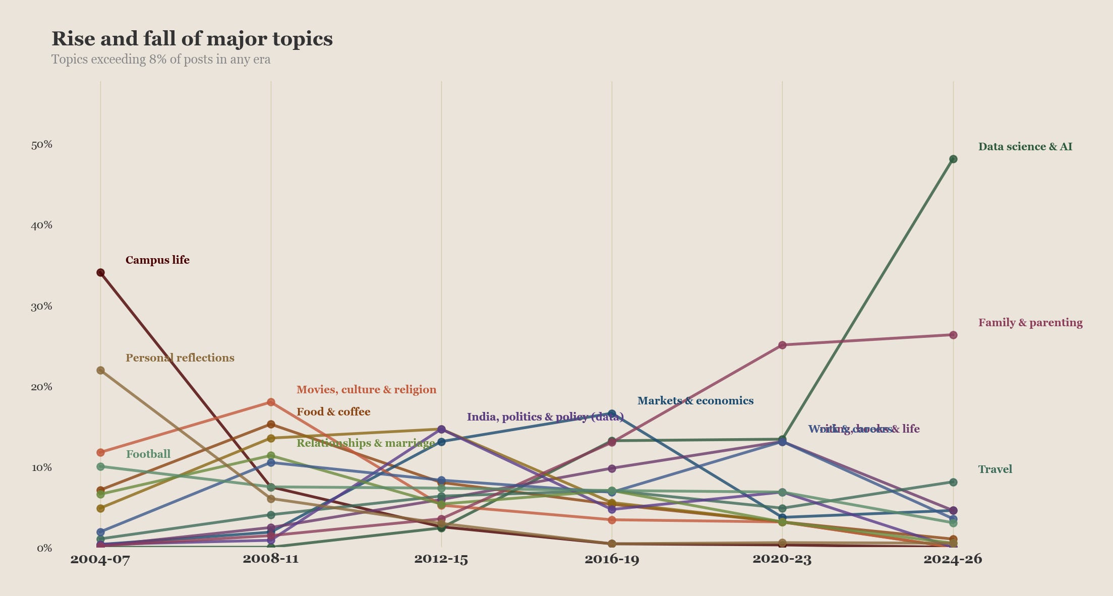 Look at the trajectory chart. Campus life starts high on the left and disappears. Data science and AI starts invisible and rockets upward on the right. It’s almost a perfect mirror image - the two defining obsessions of my blogging life, bookending twenty years.