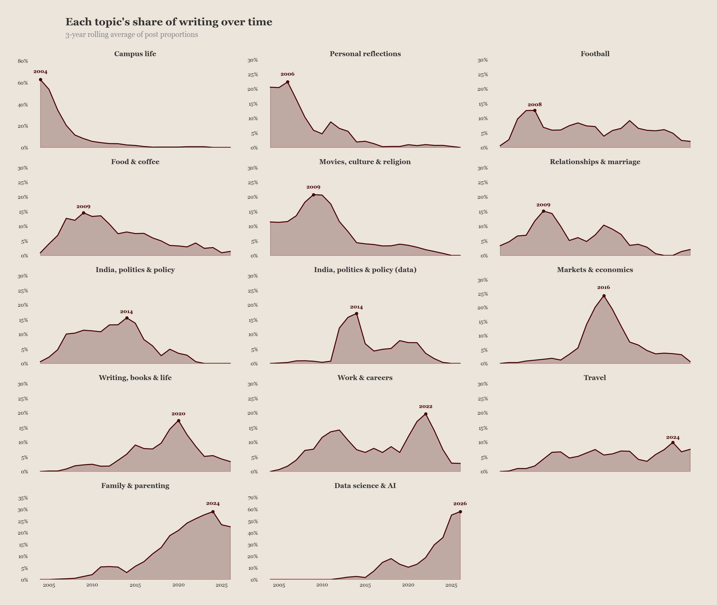 The most dramatic shape in the data is campus life - it starts at nearly 50% of everything I wrote in 2004-05, and falls off a cliff by 2008. This makes sense. I was at IIMB, and my blog was essentially a diary of quizzing, classes, placements, and the general absurdity of being on campus. Once you graduate, you stop writing about campus. Obvious in retrospect, but there it is in the data - a sharp peak and a permanent decline.