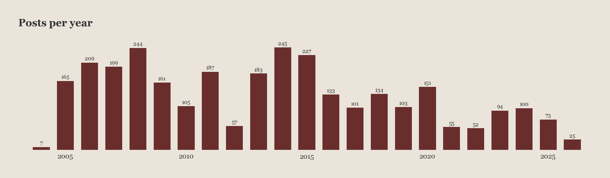 One thing the analysis doesn’t capture is that I’ve been writing less over time. My peak years were 2008 and 2014, both around 245 posts. There’s a dramatic crash in 2012 - down to 57 posts - which I know was a difficult personal period. Since 2016, I’ve been averaging about 100 posts a year, roughly half my earlier output.