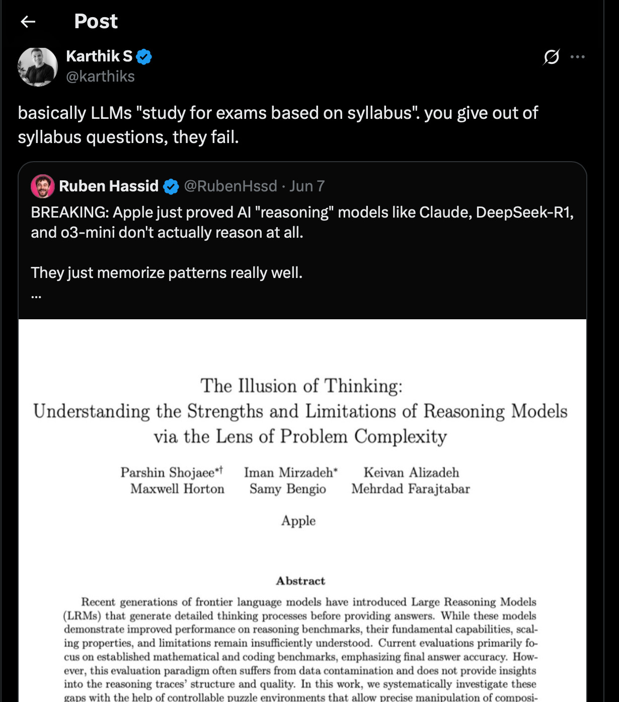 There are people who have weighed in on this to make their favourite points about “AGI”. And then there are people who have said that irrespective of this paper, LLMs still outperform humans on a lot of cognitive tasks and so they are great, and cnanot be called unintelligent.