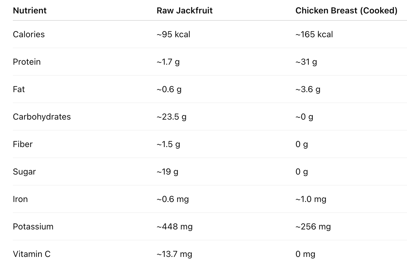 Here's a side-by-side nutrition comparison of raw jackfruit vs chicken breast (skinless, cooked) per 100 grams: